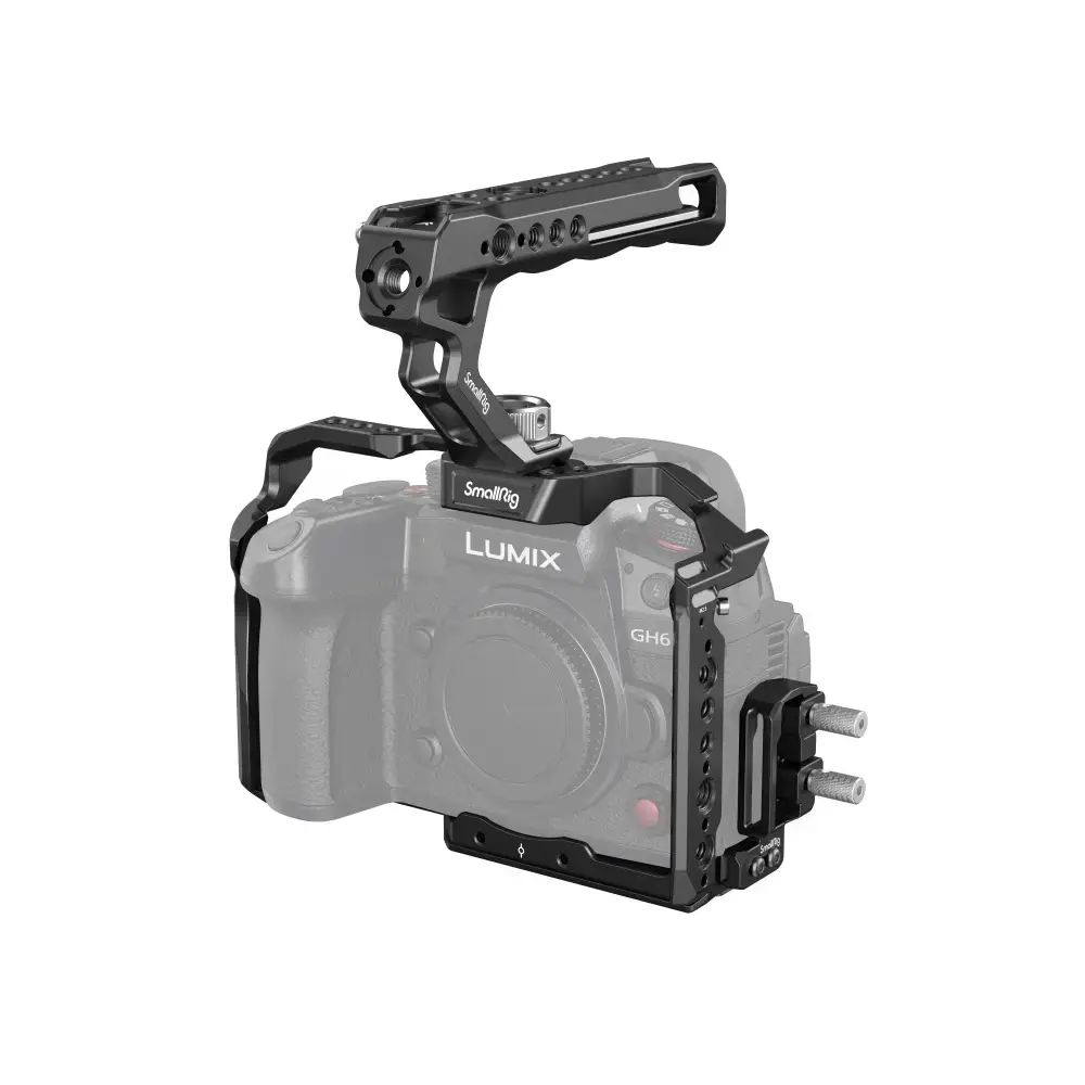 SmallRig Camera Cage Kit for Panasonic LUMIX GH6 3785 enables low-angle shot and protects camera, while providing a variety of accessory mounting points. The kit includes a cage, a HDMI & USB-C cable clamp and a top handle. The top handle feels comfortable and facilitates camera movement and low-angle shot. Like the cage, it features 1/4″-20 threaded holes for Monitor Mount 2294, a cold shoe for microphone, light, etc. and ARRI 3/8″ -16 locating holes for Monitor Mount 2903. The cage has a built-in NATO rail on the left to connect NATO accessories, with a HDMI & USB-C cable clamp fixed to its left side via two M3 screws and tightened by a thumbscrew to prevent deflection and protect HDMI & USB-C interface, ensuring stable signal transmission. Built-in Arca-Swiss quick release plate allows tripod photography and supports extended quick release plate for DJI RS 2/RSC 2/RS 3/RS 3 Pro gimbal. Besides, the cage comes with an accessible magnetic wrench for easy assembly and disassembly of accessories.